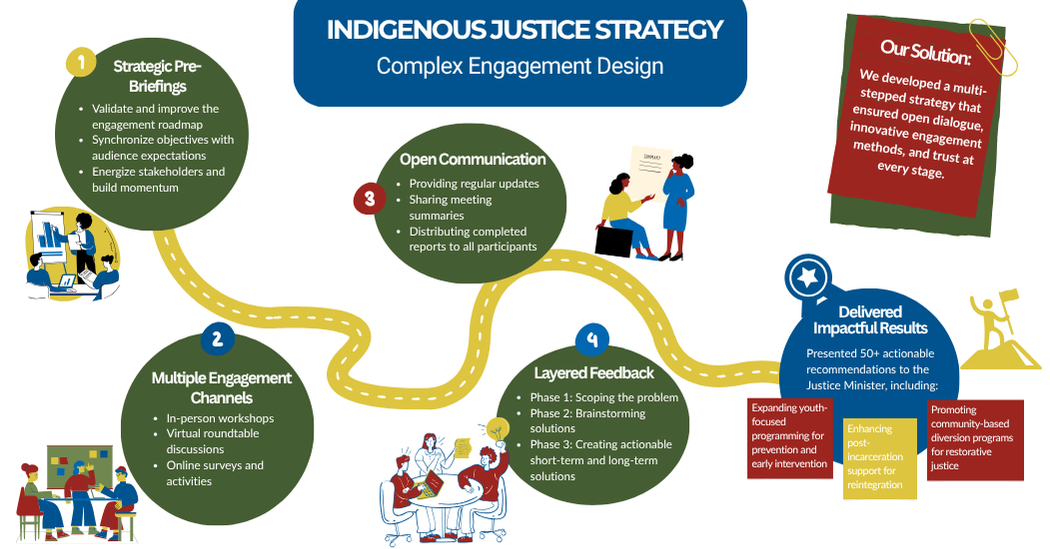 KES pioneered a two-eyed seeing approach for the Indigenous Justice Strategy, blending Indigenous ways of knowing with our public engagement expertise. For this project, we needed to balance long-term strategic innovation with short-term, immediate intervention to uplift both current and future generations. In particular, we:
