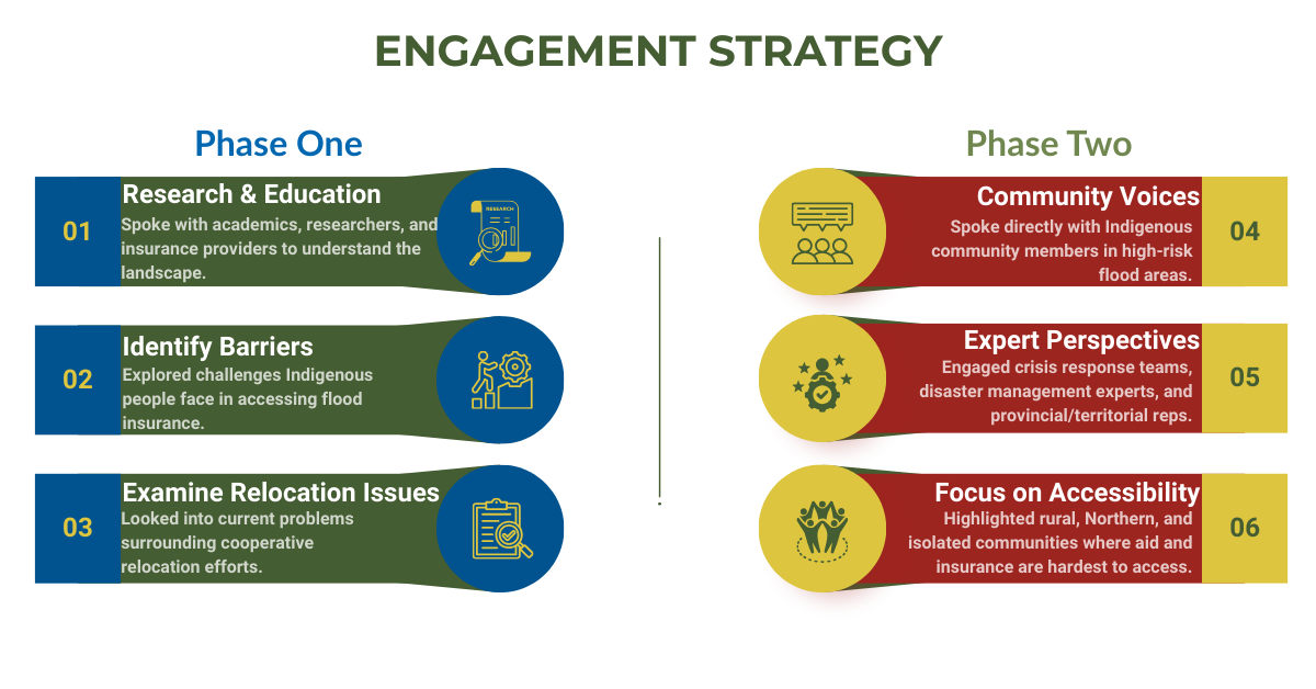 the first phase included research and education and involved speaking with academics, researchers, and insurance providers to understand the current barriers and challenges to accessing flooding insurance for Indigenous people and the current issues surrounding cooperative relocation efforts.